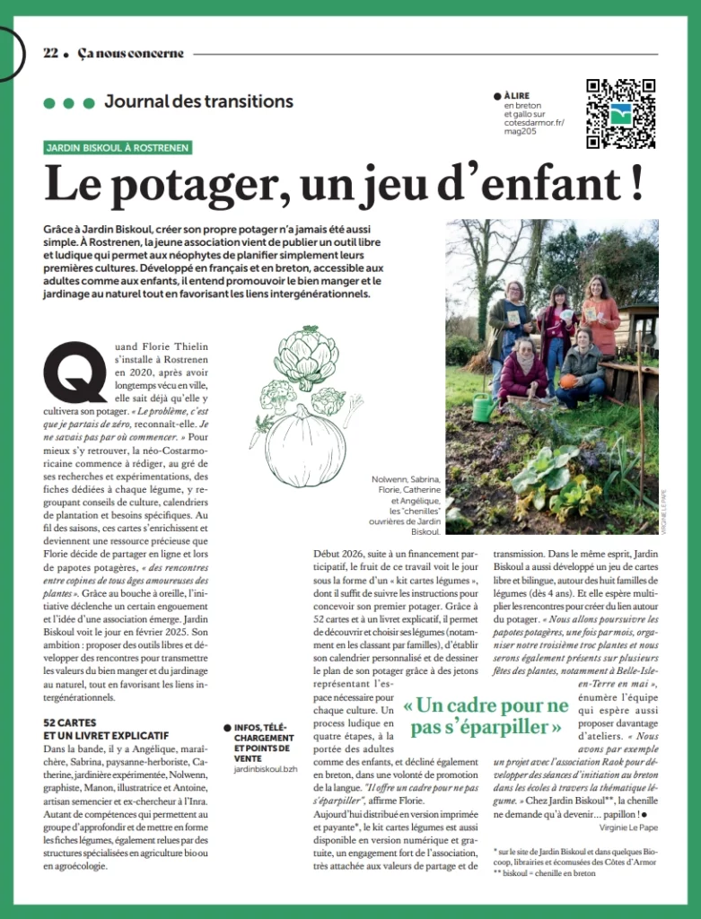 Depuis Janvier 2026, nous développons un nouveau projet avec Florie, de l’association Jardin Biskoul. Il s’agit de proposer des animations dans les écoles : des initiations à la langue bretonne autour de la thématique des légumes. Le magazine des Côtes d’Armor en parle d’ailleurs à la fin de l’article !